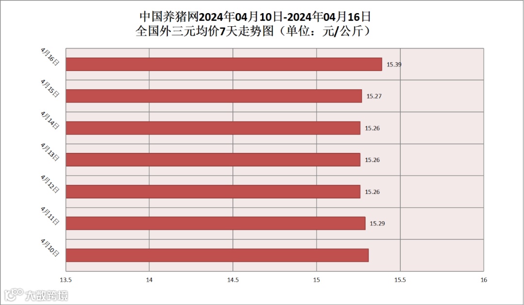 其他生猪品种方面,生猪内三元均价为15.10元/公斤,价格较昨日(15.11元/公斤)下跌了0.01元/公斤;生猪土杂猪均价为14.65元/公斤,价格较昨日(14.74元/公斤)下跌了0.09元/公斤。