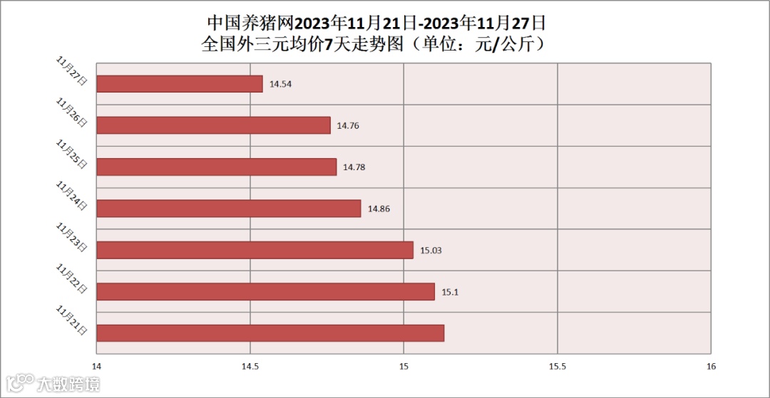 2023年11月27日(星期一),据中国养猪网猪价系统监测,全国外三元均价为14.54元/公斤,猪价较昨日(14.76元/公斤)下跌了0.22元/公斤,较上月(14.77元/公斤)下跌了0.23元/公斤。