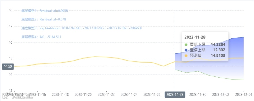 玄田算法是由项目课题组团队原创的非经典逻辑数值聚合理论和不确定性预测方法,构建了基于一致模算子的生猪价格预测模型。该模型采用的聚合函数及一致模相关理论与方法已获得多项国家自然科学基金和省级自然科学资金资助,并获得多项省级自然科学奖奖项。11月28日预测猪价为14.8103,置信区间在14.3284--15.302之间。11月29日预测猪价为14.7806;11月30日预测猪价为15.0345。