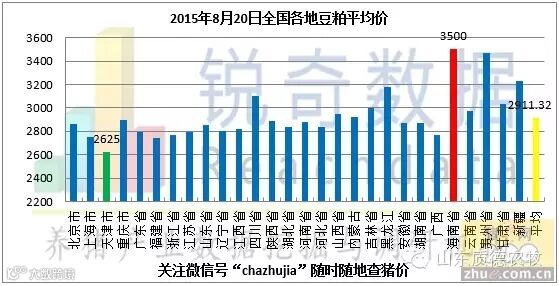 据猪e网锐奇数据检测当地豆粕报价信息统计,2015年08月20日国内各地豆粕平均价格为2911.32元/吨,较昨日(08月19日)2911.69元/吨下跌0.37元/吨,跌幅为0.01%。此次检测的省市中,最高价格海南省为3500.00元/吨,最低价格天津市2625.00元/吨(以上价格均为蛋白含量为43%的油厂豆粕报价)。今日大部分油厂豆粕现货价格与昨日相比呈现稳中带跌态势,山东部分油厂下调10元/吨,福建部分油厂下调30-50元/吨,河南部分油厂下调60元/吨。美国大豆生长优良率和上周持平,且中西部迎来骤雨补充土壤水分,进一步提振大豆产量预期,期货、现货在其刺激下呈现下调态势。