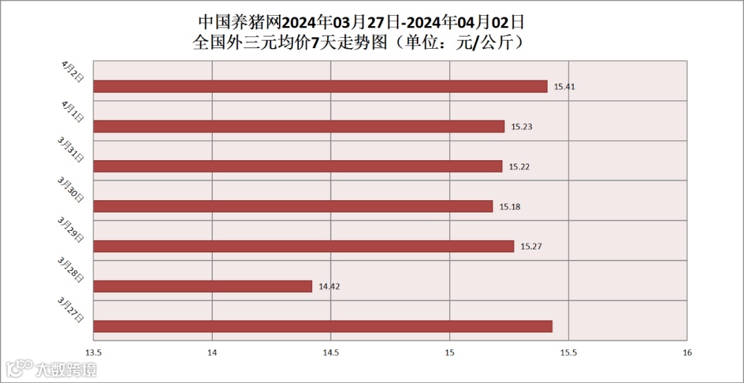 其他生猪品种方面,生猪内三元均价为15.06元/公斤,价格较昨日(15.02元/公斤)上涨了0.04元/公斤;生猪土杂猪均价为14.65元/公斤,价格较昨日(14.61元/公斤)上涨了0.04元/公斤。