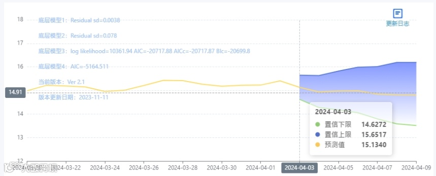 玄田算法是由项目课题组团队原创的非经典逻辑数值聚合理论和不确定性预测方法,构建了基于一致模算子的生猪价格预测模型。该模型采用的聚合函数及一致模相关理论与方法已获得多项国家自然科学基金和省级自然科学资金资助,并获得多项省级自然科学奖奖项。04月03日预测猪价为15.1340,置信区间在14.6272--15.6517之间。04月04日预测猪价为15.9426;04月05日预测猪价为14.9830。