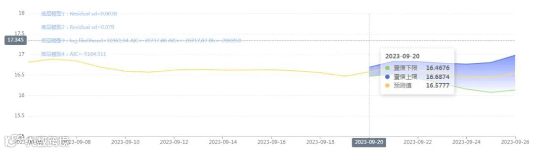 玄田算法是由项目课题组团队原创的非经典逻辑数值聚合理论和不确定性预测方法,构建了基于一致模算子的生猪价格预测模型。该模型采用的聚合函数及一致模相关理论与方法已获得多项国家自然科学基金和省级自然科学资金资助,并获得多项省级自然科学奖奖项。09月20日预测猪价为16.5777,置信区间在16.4679-16.6874之间。09月21日预测猪价为16.6796;09月22日预测猪价为16.6223。