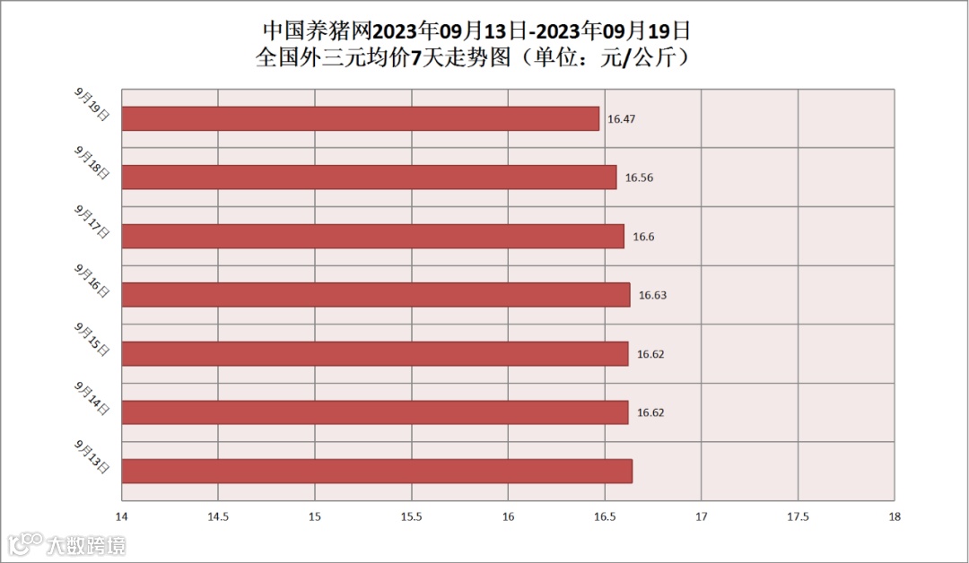 2023年09月19日(星期二),据中国养猪网猪价系统监测,全国外三元均价为16.47元/公斤,猪价较昨日(16.56元/公斤)下跌了0.09元/公斤,较上月(17.20元/公斤)下跌了0.73元/公斤。