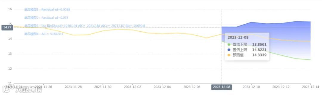 玄田算法是由项目课题组团队原创的非经典逻辑数值聚合理论和不确定性预测方法,构建了基于一致模算子的生猪价格预测模型。该模型采用的聚合函数及一致模相关理论与方法已获得多项国家自然科学基金和省级自然科学资金资助,并获得多项省级自然科学奖奖项。12月08日预测猪价为14.3339,置信区间在14.8221--14.8561之间。12月09日预测猪价为14.1681;12月10日预测猪价为14.3349。