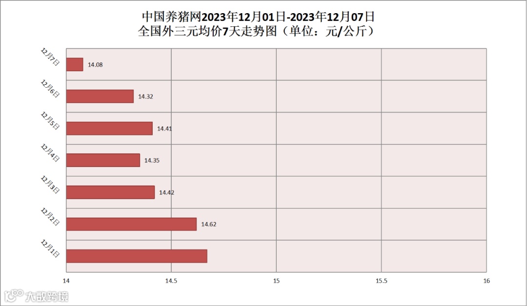 2023年12月07日(星期四),据中国养猪网猪价系统监测,全国外三元均价为14.08元/公斤,猪价较昨日(14.32元/公斤)下跌了0.24元/公斤,较上月(15.00元/公斤)下跌了0.92元/公斤。