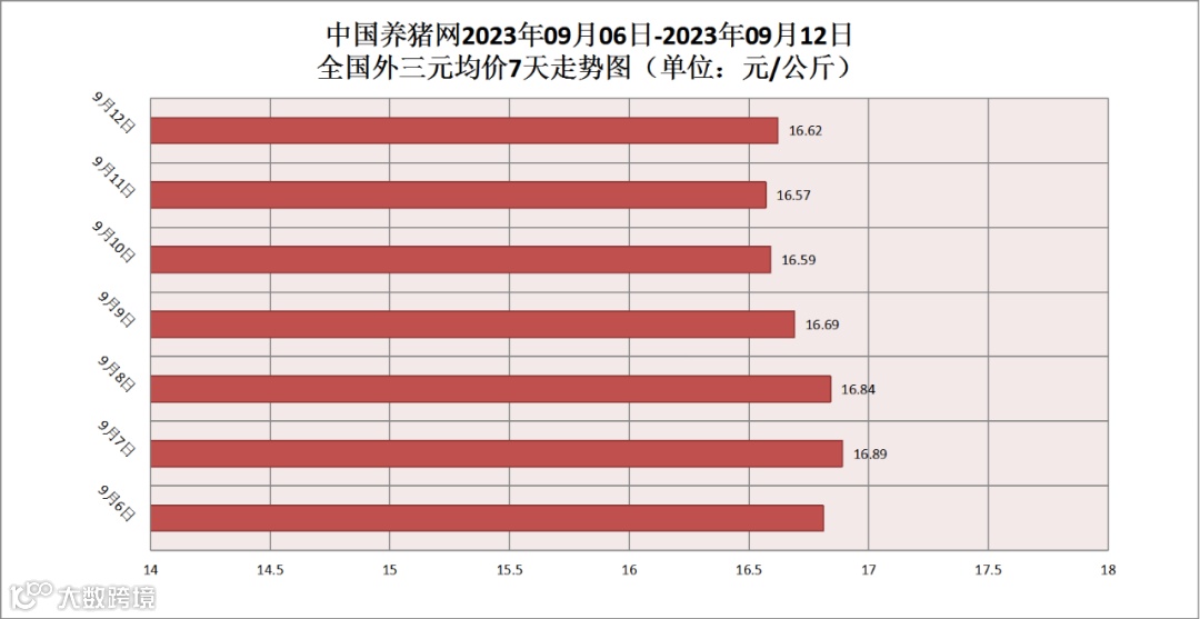2023年09月12日(星期二),据中国养猪网猪价系统监测,全国外三元均价为16.62元/公斤,猪价较昨日(16.57元/公斤)上涨了0.05元/公斤,较上月(17.22元/公斤)下跌了0.6元/公斤。