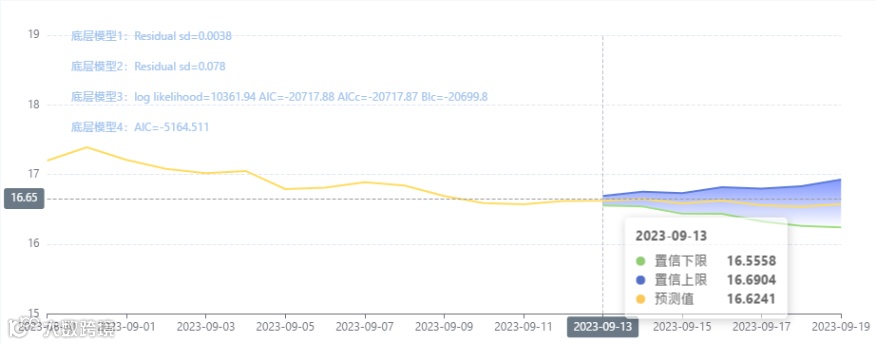 玄田算法是由项目课题组团队原创的非经典逻辑数值聚合理论和不确定性预测方法,构建了基于一致模算子的生猪价格预测模型。该模型采用的聚合函数及一致模相关理论与方法已获得多项国家自然科学基金和省级自然科学资金资助,并获得多项省级自然科学奖奖项。09月13日预测猪价为16.6241,置信区间在16.5558-16.6904之间。09月14日预测猪价为16.6473;09月15日预测猪价为16.5851。