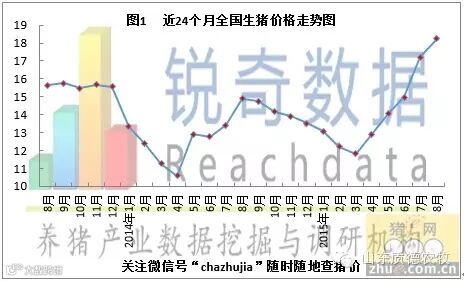 据猪e网锐奇数据监测中心数据显示,2015年08月全国生猪平均价格为18.25元/公斤,环比上月上涨1.05元/公斤,张幅为6.10%。同比去年8月环比上涨3.36元/公斤,涨幅为22.57%(如图1)。