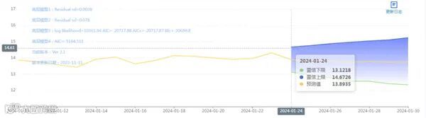 玄田算法是由项目课题组团队原创的非经典逻辑数值聚合理论和不确定性预测方法,构建了基于一致模算子的生猪价格预测模型。该模型采用的聚合函数及一致模相关理论与方法已获得多项国家自然科学基金和省级自然科学资金资助,并获得多项省级自然科学奖奖项。01月24日预测猪价为13.8935,置信区间在13.1218--14.6726之间。01月25日预测猪价为13.8359;01月26日预测猪价为13.8125。