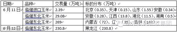 据猪e网锐奇数据检测当地玉米报价信息统计,2015年06月09日国内各地玉米平均价格为2419.08元/吨,较昨日(06月08日)2416.37元/吨上涨2.71元/吨,涨幅为0.11%。据此次检测的省市中,最高价格为湖南省2663.00元/吨,最低价格甘肃省2210.00元/吨(以上价格均已换算成含水分为14%的标准玉米)。今日玉米深加工企业收购价格呈现稳定态势,吉林地区深加工企业继续停收,东北地区粮源以临储粮拍卖为主,今日山东部分深加工企业收购价格下调幅度在10元/吨以内。下图为本周四、五的临储粮食拍卖情况:
