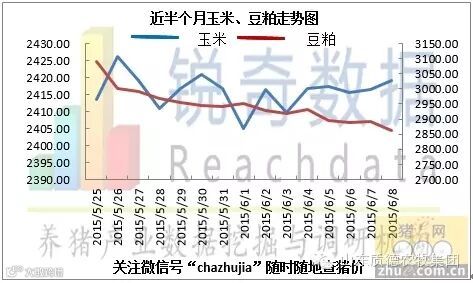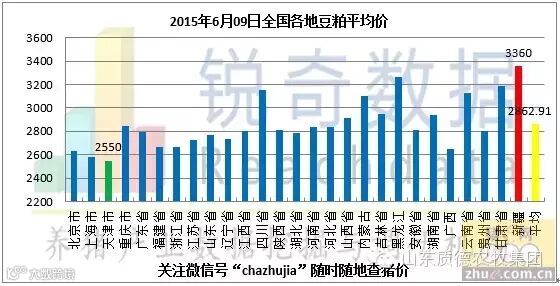 据猪e网锐奇数据检测当地豆粕报价信息统计,2015年06月09日国内各地豆粕平均价格为2862.91元/吨,较昨日(06月07日)2892.75元/吨下跌29.84元/吨,跌幅为1.03%。据此次检测的省市中,最高价格新疆省3360元/吨,最低价格天津市2550.00元/吨(以上价格均为蛋白含量为43%的油厂豆粕报价)。今日大部分油厂豆粕现货报价与昨日相比维持稳定,个别厂家稍微有所下调,东北地区个别油厂报价下调20元/吨,全国各地主要油厂现货报价在2550-2750元/吨之间,南方不少地区豆粕价格比东北玉米价格还要便宜。6月份大豆进口压力依然较大,需求疲软,豆粕现货价格在低位震荡,易受各方炒作因素影响反弹。