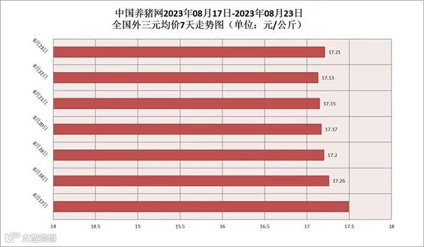 2023年08月23日(星期三),据中国养猪网猪价系统监测,全国外三元均价为17.21元/公斤,猪价较昨日(17.13元/公斤)上涨了0.08元/公斤,较上月(14.23元/公斤)上涨了2.98元/公斤。