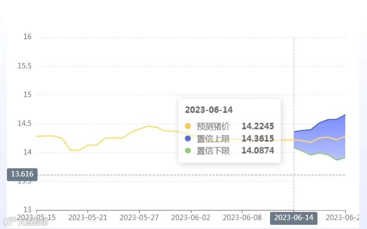 玄田算法是由项目课题组团队原创的非经典逻辑数值聚合理论和不确定性预测方法,构建了基于一致模算子的生猪价格预测模型。该模型采用的聚合函数及一致模相关理论与方法已获得多项国家自然科学基金和省级自然科学资金资助,并获得多项省级自然科学奖奖项。6月14日预测猪价为14.2245,置信区间在14.0874--14.3615之间。6月15日预测猪价为14.2064;6月16日预测猪价为14.1768。