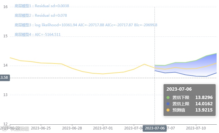 玄田算法是由项目课题组团队原创的非经典逻辑数值聚合理论和不确定性预测方法,构建了基于一致模算子的生猪价格预测模型。该模型采用的聚合函数及一致模相关理论与方法已获得多项国家自然科学基金和省级自然科学资金资助,并获得多项省级自然科学奖奖项。07月06日预测猪价为13.9215,置信区间在13.8296-14.0162之间。07月07日预测猪价为13.8769;07月08日预测猪价为13.9374。