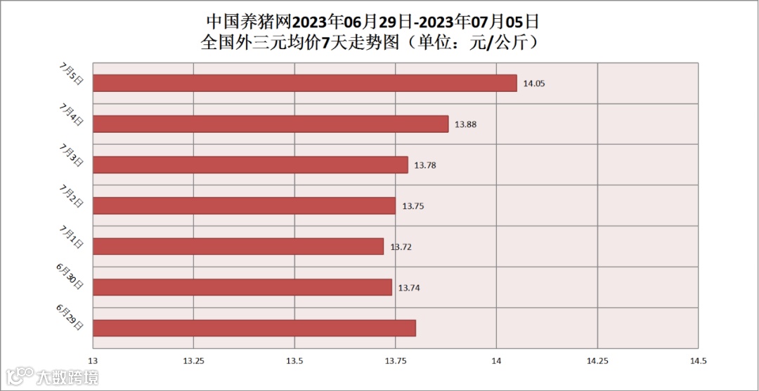 2023年07月05日(星期三),据中国养猪网猪价系统监测,全国外三元均价为14.05元/公斤,猪价较昨日(13.88元/公斤)上涨了0.17元/公斤,较上月(14.22元/公斤)下跌了0.17元/公斤。
