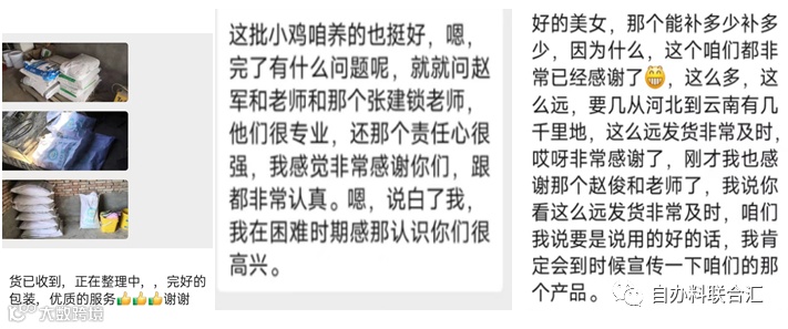近期广大养殖朋友的好评反馈不断,这些有跟随自办料很多年的“铁粉”,也有使用几次就觉得料好、鸡群状态好、产蛋周期延长的新朋友,大家对自办料的信任和支持是我们追求和前进的动力!