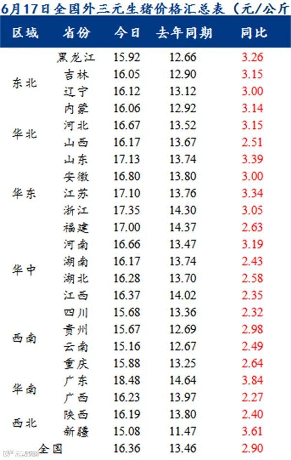 据钢联数据显示6月17日全国外三元标猪均价16.36元/公斤,同比涨幅17.6%左右。从去年的1500-2800元/头的高价利润到至今自繁自养亏损30元/头左右,将近一年时间不管自繁自养,还是外采仔猪,养殖行业都是长时间处于亏损阶段。