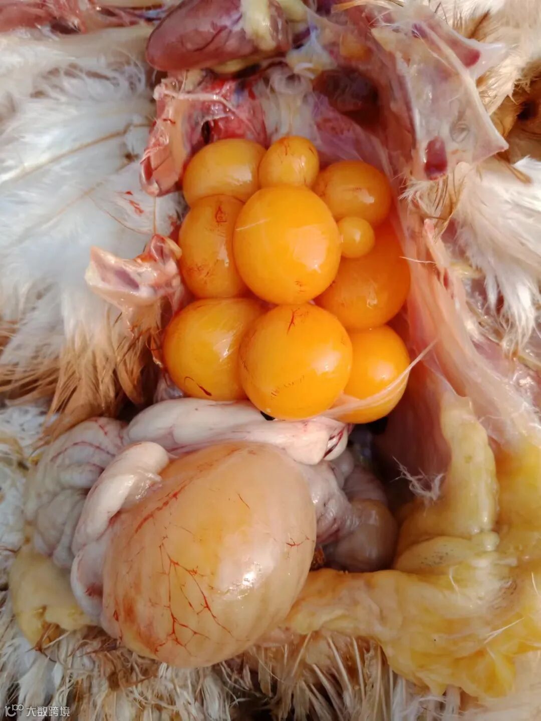 器官功能的退行性变化:长期高强度工作易导致卵巢功能减退,表现为优势卵泡发育迟缓、数量减少(从每天1个降至每2天1个),产蛋率随之下降5%-10%;输卵管黏膜长期受机械摩擦和分泌物刺激,易引发输卵管炎症,典型症状为蛋清中带血丝、蛋壳表面附着黏液或血迹,严重时出现输卵管脱垂(脱肛),死淘率升高1%-2%。此外,卵巢排卵频率增加会导致肝脏合成卵黄前体物质(如极低密度脂蛋白、卵黄磷脂)的压力骤增,间接诱发肝脏代谢紊乱。