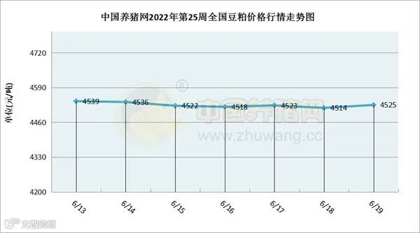 据中国养猪网猪价系统数据监测,2022年第25周(2022年06月13日至2022年06月19日)本周豆粕价格呈现小幅下跌趋势,周初期至周中期呈震荡下跌走势,周中期至周末期先跌后涨。全周豆粕价格区间在4514-4639元/吨之间,周初豆粕价格为4539元/吨,周末价格为4525元/吨,全周豆粕价格累计下跌了25元/吨。