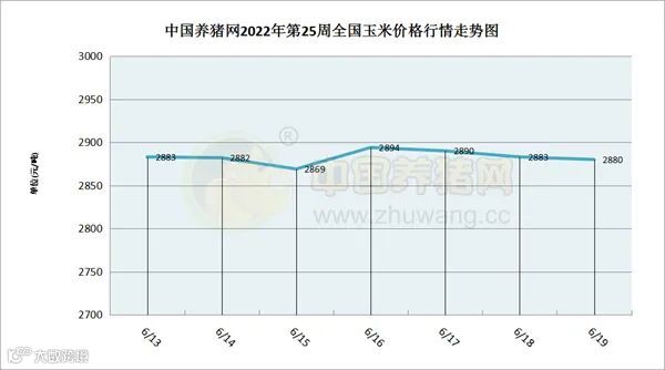 据中国养猪网猪价系统数据监测,2022年第25周(2022年06月13日至2022年06月19日)本周我国玉米价格呈现震荡下跌走势,周初期至周中期先稳后跌,周中期至周末期猛跌后大幅回升。全周玉米价格区间在2869-2894元/吨,周初期玉米价格为2883元/吨,周末期价格为2880元/吨,全周玉米价格累计下跌了3元/吨。