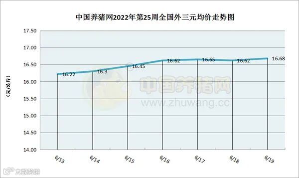 据中国养猪网猪价系统数据监测,2022年第25周(2022年06月13日至2022年06月19日)全国外三元生猪价格走势呈现逐渐走高趋势,涨到了8.5元猪价以上,周初期至周末期呈上涨趋势,涨幅上涨逐渐走强。本周猪价区间在16.22-16.68元/公斤之间!周初猪价为16.22元/公斤,周末猪价为16.68元/公斤,全周猪价累计上涨了0.46元/公斤。