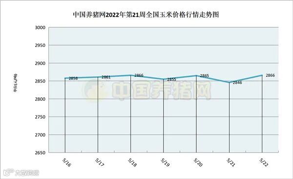 据中国养猪网猪价系统数据监测,2022年第21周(2022年05月16日至2022年05月22日)本周我国玉米价格呈现涨跌互现走势,周初微幅上涨,周中期至周末期以震荡为主。全周玉米价格区间在2846-2866元/吨,周初期玉米价格为2858元/吨,周末期价格为2866元/吨,全周玉米价格累计上涨了8元/吨。