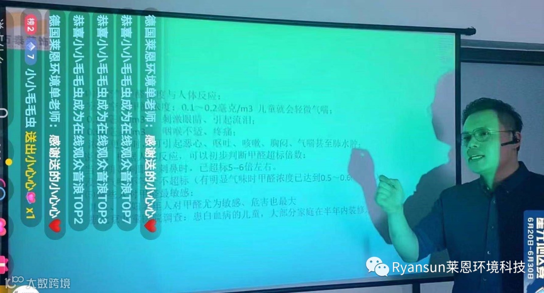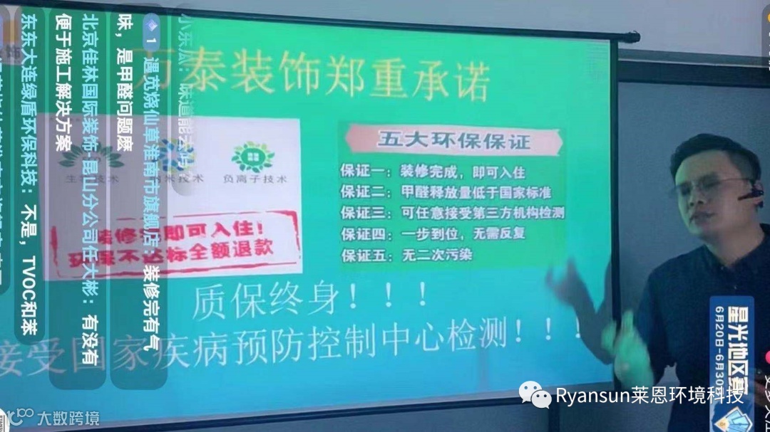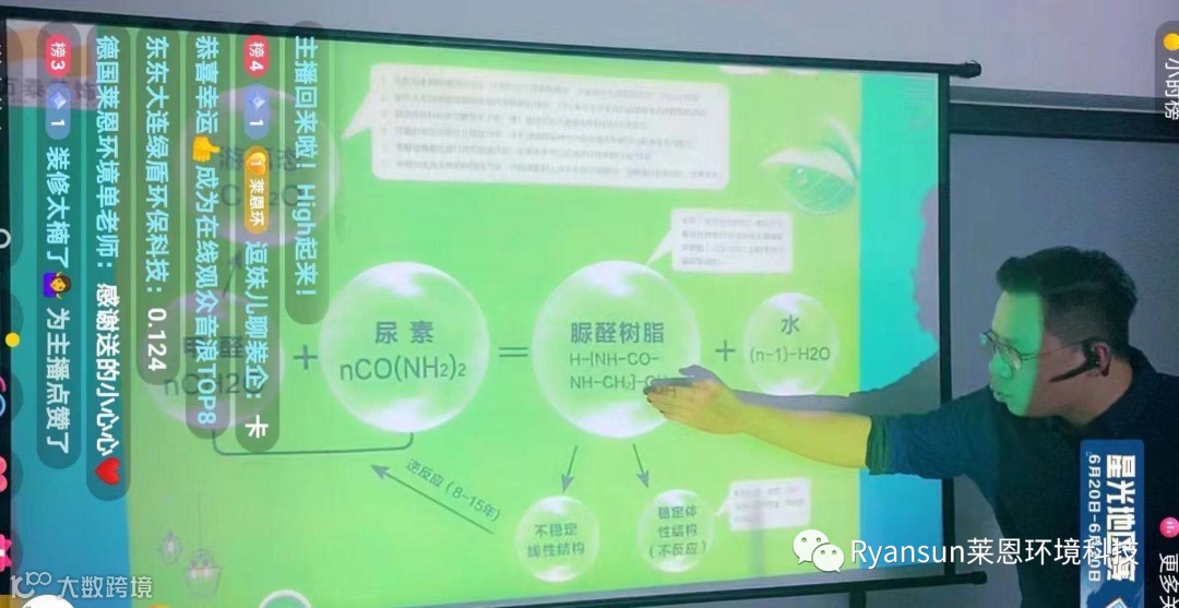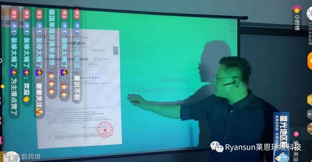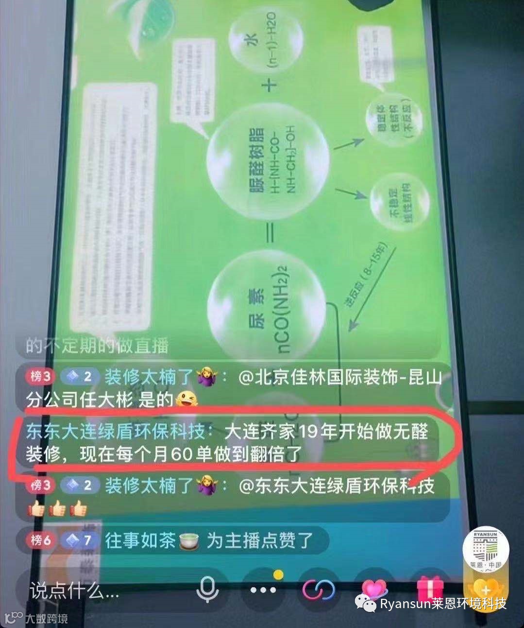 现场也有游客通过抖音平台进入直播间,并提出相应市场类问题时,莱恩环境合作5年的老客户大连绿盾环保也积极回应,用市场的真实反馈告诉新客户,无醛工艺帮助装企的真实效果。