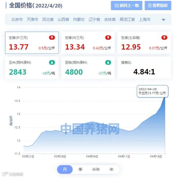 相较昨日(2022年04月19日)13.27元/公斤,价格上涨0.50元/公斤;