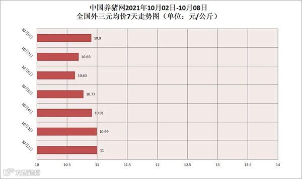 2021年10月08日(星期五),据中国养猪网猪价系统监测,全国外三元均价为10.90元/公斤,猪价较昨日(10.69元/公斤)上涨了0.21元/公斤,较上月(13.83元/公斤)下跌了2.93元/公斤。