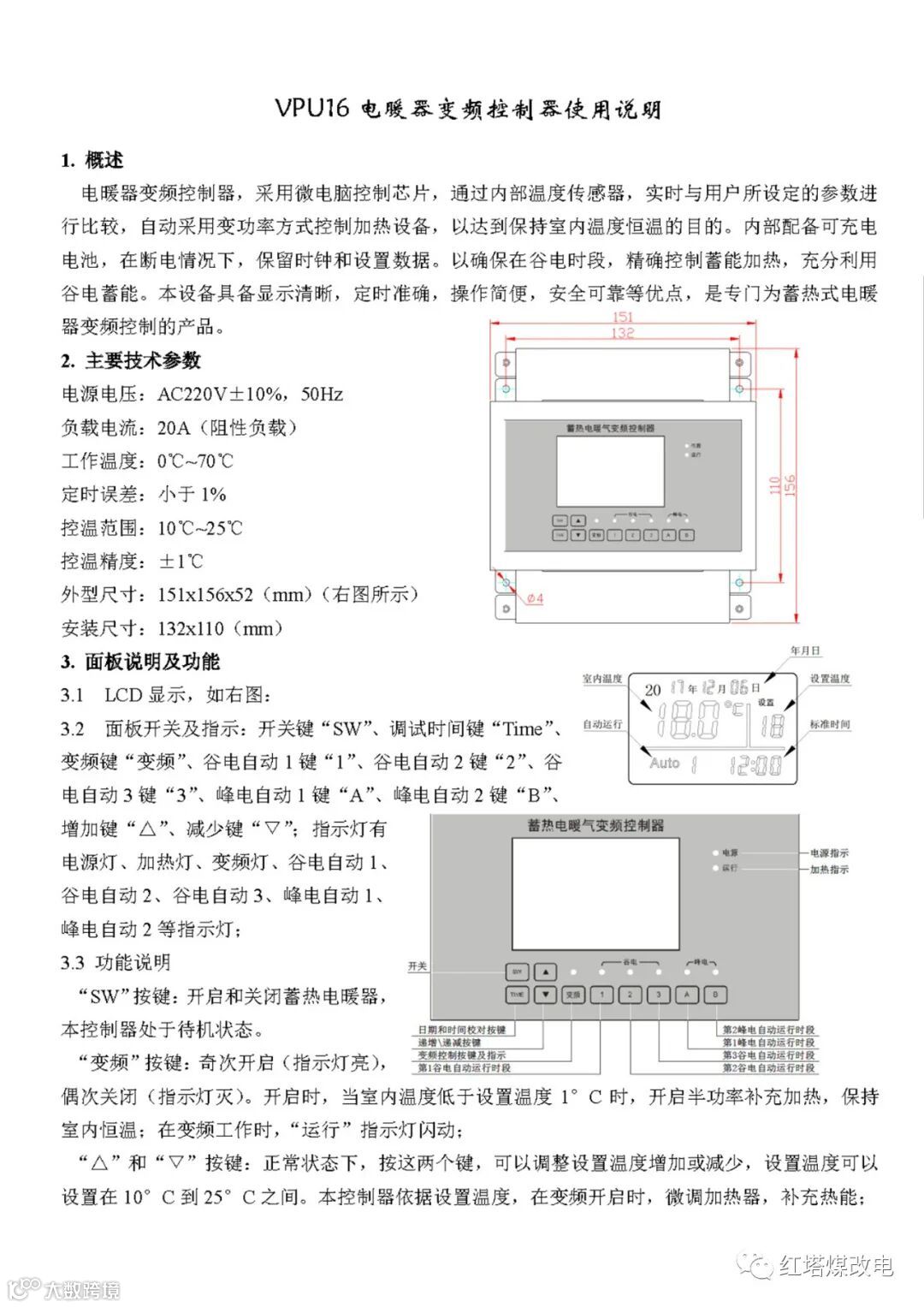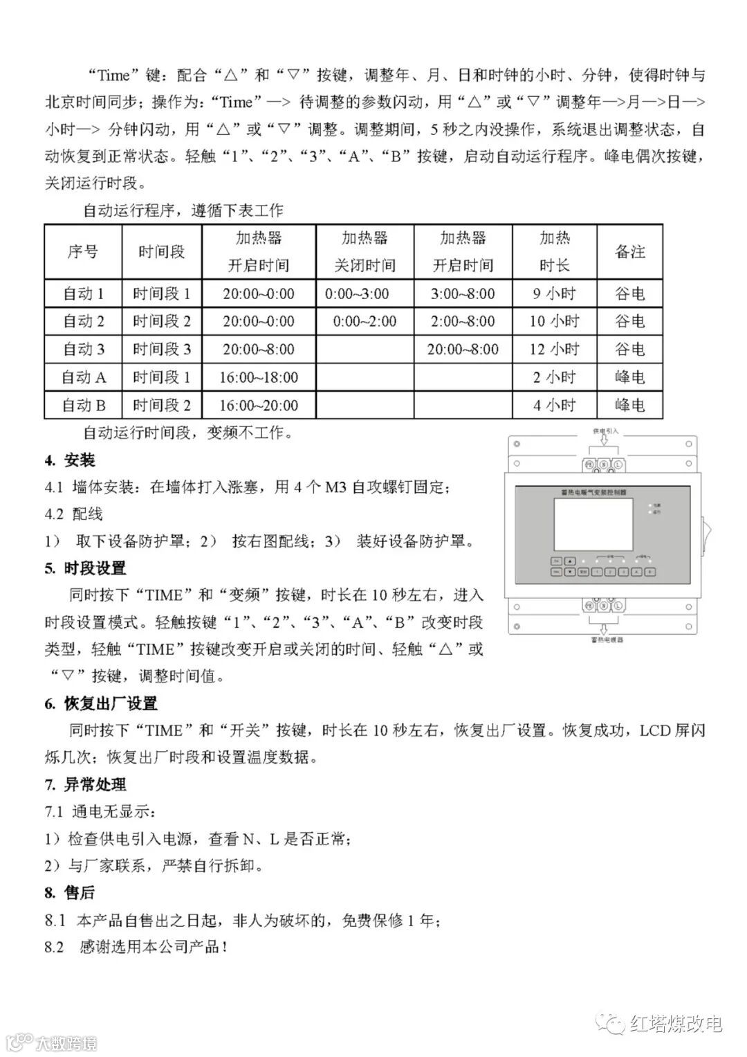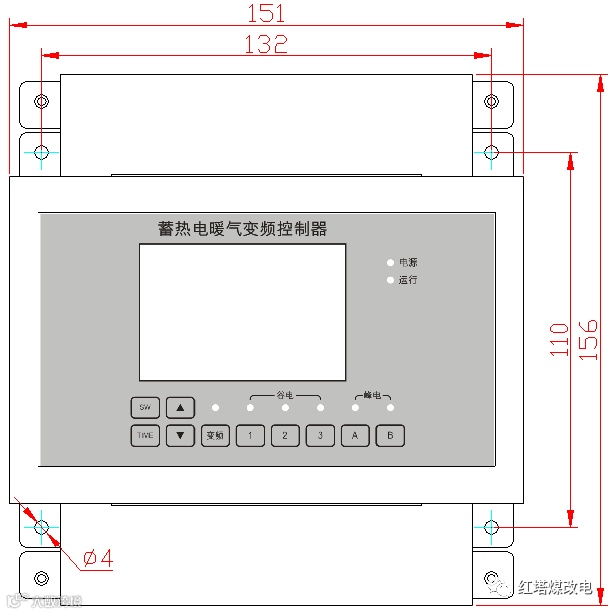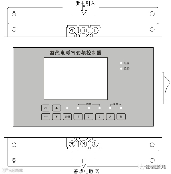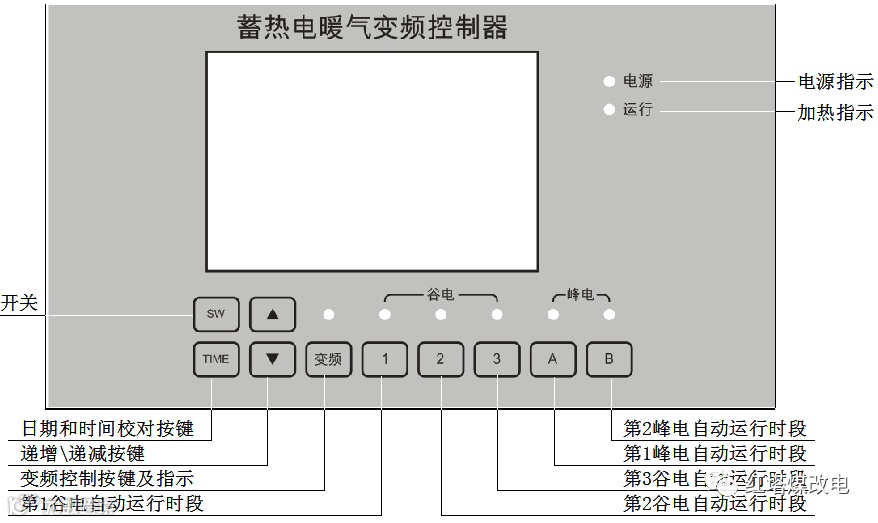 开关键“SW”、调试时间键“Time”、变频键“变频”、谷电自动1键“1”、谷电自动2键“2”、谷电自动3键“3”、峰电自动1键“A”、峰电自动2键“B”、增加键“△”、减少键“▽”;指示灯有电源灯、加热灯、变频灯、谷电自动1、谷电自动2、谷电自动3、峰电自动1、峰电自动2等指示灯;