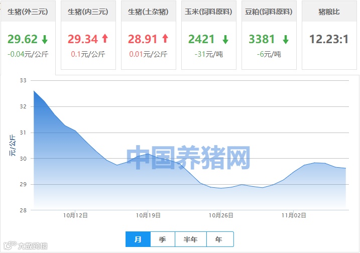 | 地区名称 | 外三元(元/公斤) | 内三元(元/公斤) | 土杂猪(元/公斤) | 玉米(元/吨) | 豆粕(元/吨) |