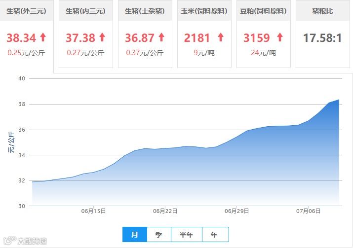 | 地区名称 | 外三元(元/公斤) | 内三元(元/公斤) | 土杂猪(元/公斤) | 玉米(元/吨) | 豆粕(元/吨) |