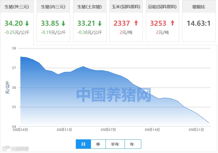 | 地区名称 | 外三元(元/公斤) | 内三元(元/公斤) | 土杂猪(元/公斤) | 玉米(元/吨) | 豆粕(元/吨) |