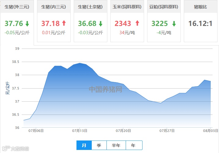 | 地区名称 | 外三元(元/公斤) | 内三元(元/公斤) | 土杂猪(元/公斤) | 玉米(元/吨) | 豆粕(元/吨) |