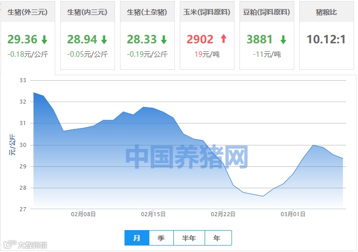 | 地区名称 | 外三元(元/公斤) | 内三元(元/公斤) | 土杂猪(元/公斤) | 玉米(元/吨) | 豆粕(元/吨) |