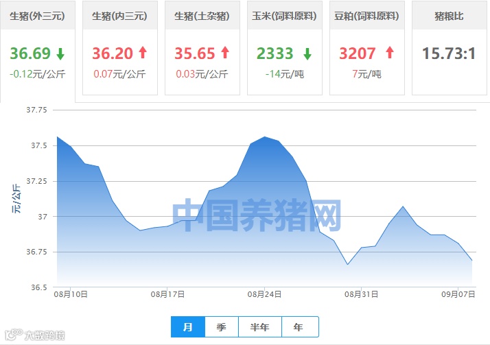 | 地区名称 | 外三元(元/公斤) | 内三元(元/公斤) | 土杂猪(元/公斤) | 玉米(元/吨) | 豆粕(元/吨) |