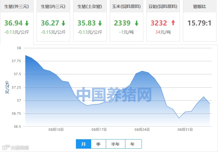 | 地区名称 | 外三元(元/公斤) | 内三元(元/公斤) | 土杂猪(元/公斤) | 玉米(元/吨) | 豆粕(元/吨) |