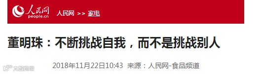 11月22日,人民网刊发《董明珠:不断挑战自我,而不是挑战别人》一文。