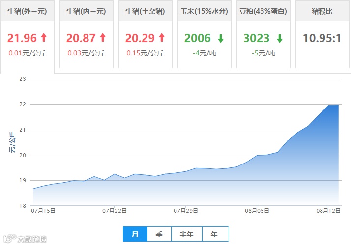 | 地区名称 | 外三元(元/公斤) | 内三元(元/公斤) | 土杂猪(元/公斤) | 玉米(元/吨) | 豆粕(元/吨) |