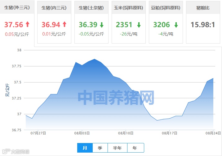 | 地区名称 | 外三元(元/公斤) | 内三元(元/公斤) | 土杂猪(元/公斤) | 玉米(元/吨) | 豆粕(元/吨) |