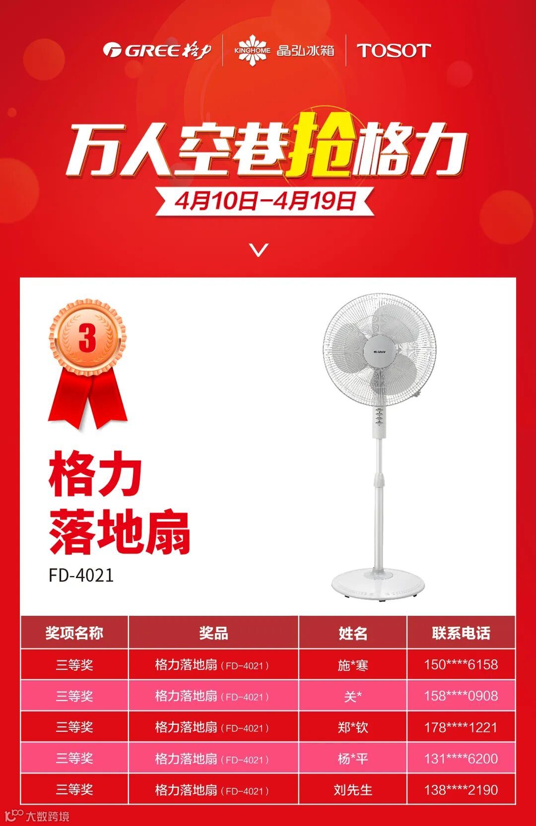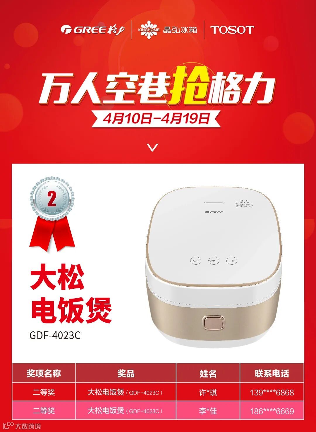 本次中奖名单仅针对#万人空巷抢格力#4月10日至4月19日活动期间成功购机的用户