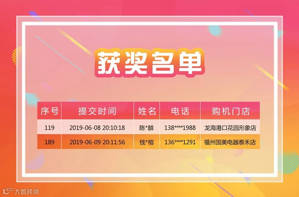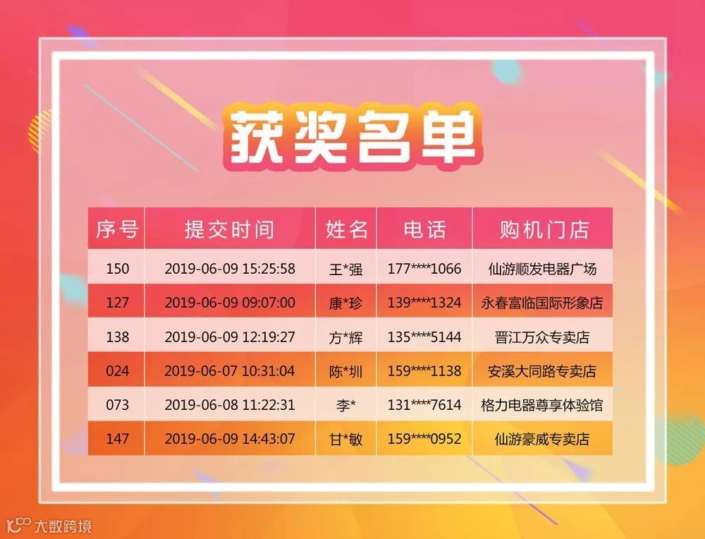 恭喜以上六位顾客分别获得