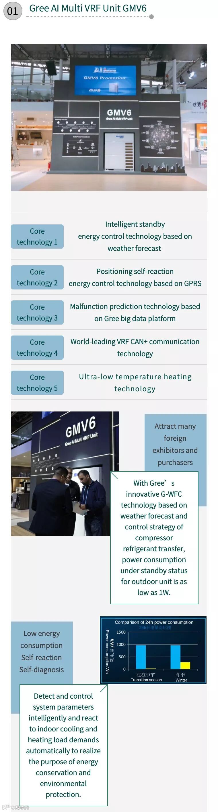 搭载格力首创的G-WFC技术结合天气预报、压缩机冷媒迁移特性的控制策略,实现室外机待机耗电低至1W。