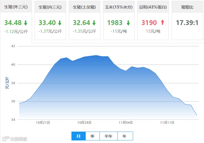 | 地区名称 | 外三元(元/公斤) | 内三元(元/公斤) | 土杂猪(元/公斤) | 玉米(元/吨) | 豆粕(元/吨) |