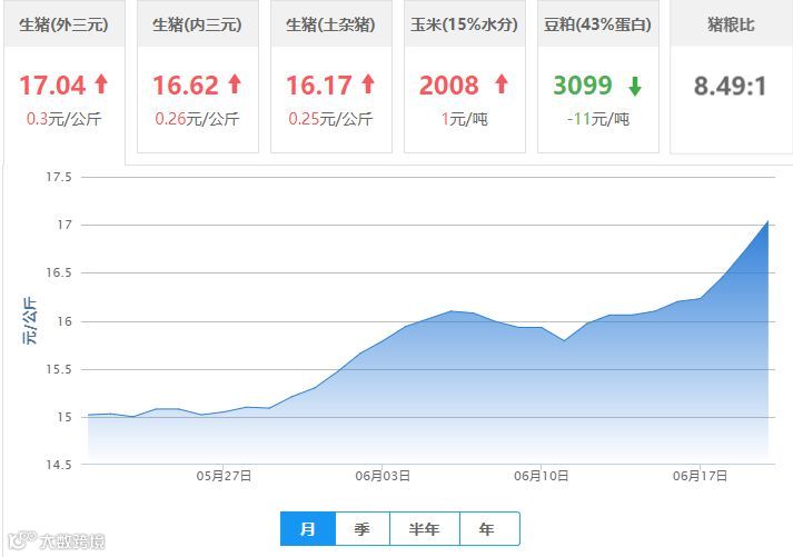 | 地区名称 | 外三元(元/公斤) | 内三元(元/公斤) | 土杂猪(元/公斤) | 玉米(元/吨) | 豆粕(元/吨) |