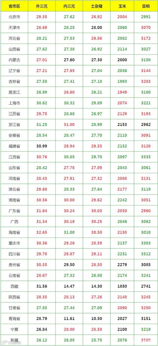 外三元生猪均价29.18元/公斤,较昨日上涨0.11元/公斤。外三元生猪涨幅最大为云南,较昨日上涨0.98元/公斤。外三元生猪跌幅最大为上海,较昨日下跌0.83元/公斤。周涨幅最大为云南,涨3.11元/公斤。外三元猪价最高海南,价格为32.65元/公斤,较昨日上涨0.31元/公斤。
