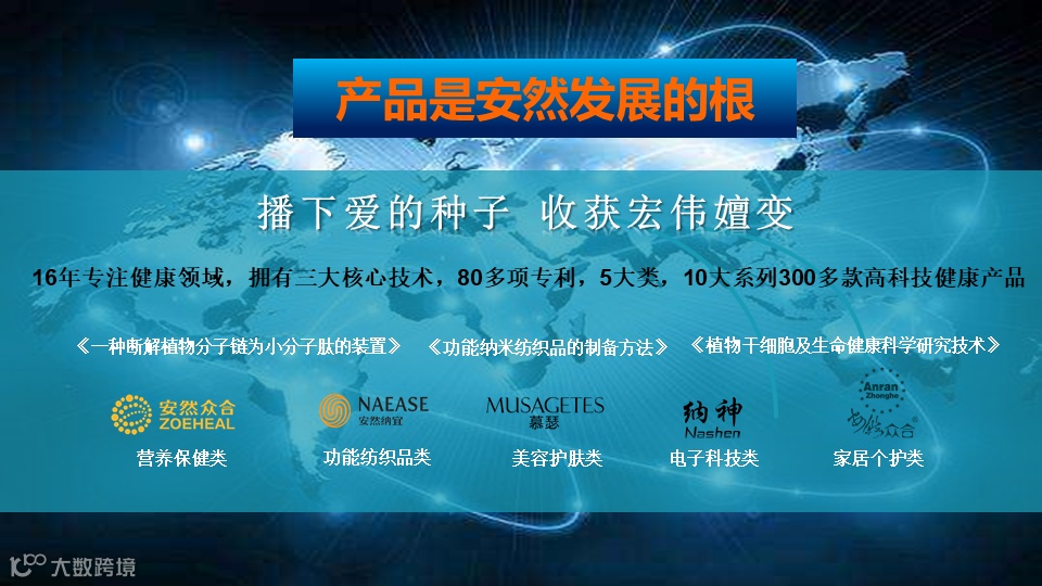 安然集团作为大健康产业的一员,专注健康领域,拥有三大核心技术,80多项专利,5大类,10大系列300多款高科技健康产品。可以说,科技化的安然,产品是安然发展的根。