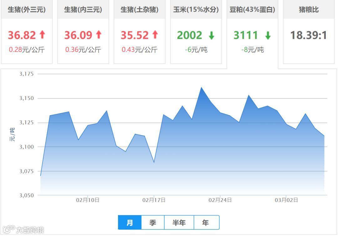 | 地区名称 | 外三元(元/公斤) | 内三元(元/公斤) | 土杂猪(元/公斤) | 玉米(元/吨) | 豆粕(元/吨) |