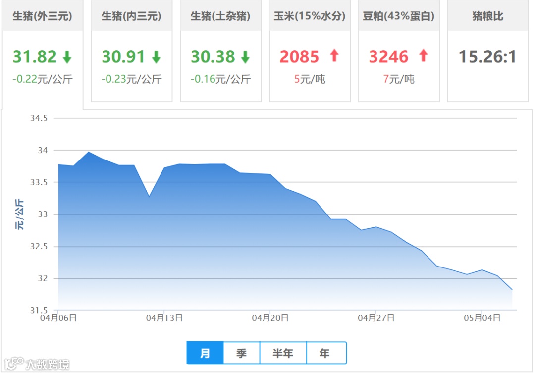 | 地区名称 | 外三元(元/公斤) | 内三元(元/公斤) | 土杂猪(元/公斤) | 玉米(元/吨) | 豆粕(元/吨) |
